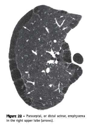 Paraseptal emphysema affects predominantly the distal alveoli and their ducts and sacs. It is characteristically delimited by any pleural surface or interlobular septa. On CT scans, it is characterized by areas of low attenuation in the subpleural and peribronchovascular regions, separated by intact interlobular septum (Figure 22).(37,38) It is sometimes associated with bullae.
