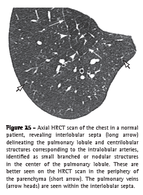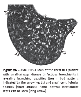The centrilobular region comprises the central portion of the secondary pulmonary lobule, consisting of the pulmonary artery, bronchiole and surrounding lung interstitium.(45) On HRCT scans of normal patients, it corresponds to a small nodular or linear image, located 3-10 mm from the pleural surface or the interlobular septum, representing the intralobular pulmonary artery and measuring approximately 1 mm in diameter (Figure 25).(46,47) The corresponding bronchiole, when normal, has walls with approximate thickness of 0.15 mm, below the resolution limits of the HRCT. Therefore, the bronchiolar disease that produces an enhancement of the centrilobular structure occurs when there is thickening of the bronchiolar wall or filling of the bronchiolar lumen (Figure 26).