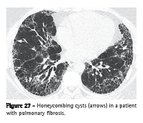Honeycombing is characterized by pulmonary cysts created as a result of the destruction of the distal air spaces due to parenchymal fibrosis, with loss of acinar and bronchiolar architecture. Honeycombing cysts are covered with metaplastic bronchiolar epithelium and represent the end stage of a number of pulmonary diseases.(1,48) On HRCT scans, honeycombing is characterized by multiple cysts, generally subpleural and of comparable diameters (typically 0.3-1 cm), grouped on layers and sharing well-defined walls of 1-3 mm in thickness (Figure 27).(49)