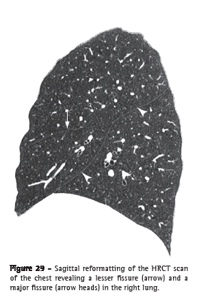 Fissure is the invagination of the visceral pleura that covers the outer surface of the lung to the parenchyma.(7) Each interlobar fissure is formed by the juxtaposition of two layers of visceral pleura. In general, we can identify major (oblique) fissures, which separate the lower lobes from the others, and the lesser (horizontal) fissure, distinguishing the middle lobe from the right upper lobe (Figure 29). Supernumerary fissures are frequently found.
