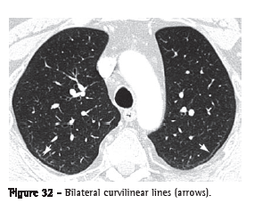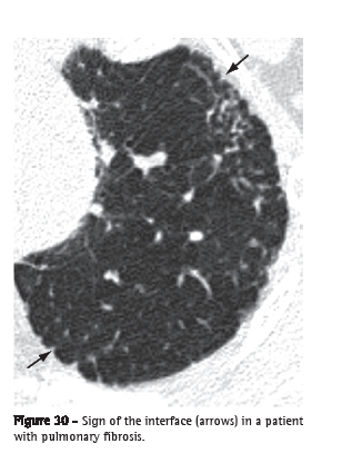 An interface is the separation between two structures or spaces. When two thoracic structures with different radiological densities are juxtaposed, their boundaries are clear. For example, vessels presenting soft tissue density coming into contact with the air density of the surrounding ventilated lung. The "sign of the interface" defines the irregularity of the margins of different intrathoracic structures, such as vessels, bronchi and pleural surfaces, generally resulting from interstitial disease that causes fibrosis (Figure 30).(3)