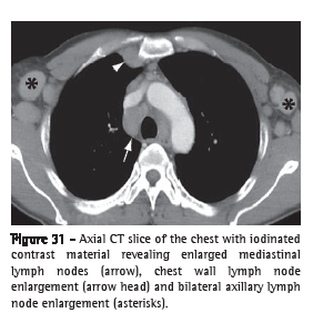 Lymph node enlargement is characterized by the increase in volume in one or more lymph nodes, due to any cause, surpassing the dimensional limits considered normal for the lymph node chain in question (Figure 31).(52,53) The term "adenomegaly" is not an acceptable synonym, since lymph nodes are not true glandular structures. The term "linfonodopatia" ("lymphatic disease") is reserved for situations in which a disease, such as necrosis, has been identified within a lymph node.