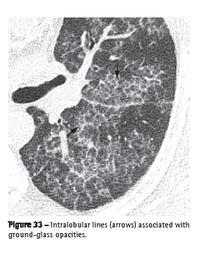 Interlobular septal thickening is the thickening of the connective tissue septa separating the secondary pulmonary lobules. It is radiographically characterized by thin linear opacities, also designated Kerley B lines. It is usually in close contact with the lateral pleural surface, near the costophrenic sulci, at a right angle to the pleural wall. Currently, the terms "septal lines" or "septal thickening" have gained favor over Kerley lines. On HRCT scans (Figure 23), the thickening of the interlobular septa is characterized by the presence of linear opacities that delimit the secondary pulmonary lobules, more easily characterized in the subpleural region, in which it has the aspect of lines at right angles to the pleural surface.(3,44) In the central regions of the lungs, the thickening of the septa of adjacent lobules results in the aspect of polygonal arches. Septal thickening can be secondary to changes in any of its components (veins, lymphatic vessels or connective tissue) and is a finding common to various lung alterations; however, its presence is particularly highlighted in cases of pulmonary edema and lymphangitic carcinomatosis. Septal thickening can be smooth (Figure 23), nodular (Figure 24) or irregular. This differentiation can aid in the differential diagnosis.