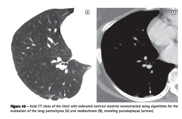 Plate-like atelectasis is a focal area of subsegmental atelectasis with linear or discoid configuration, almost always extending to the pleura (Figure 4). It is generally horizontal or oblique, but it can also have a vertical orientation. The thickness of laminar atelectasis can range from a few millimeters to over 1 cm.(14) Laminar atelectasis is synonymous with discoid atelectasis.
