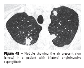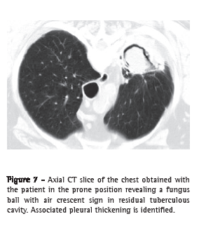 A fungus ball results from the fungal colonization of preexisting pulmonary cavitation, generally secondary to tuberculosis or sarcoidosis, but it can also occur within cysts (e.g., bronchogenic cyst), bullae or dilated bronchi. Colonization by Aspergillus spp. is the most common type of colonization, and in this case, the term "aspergilloma" is used. A fungus ball is characterized by a mass-like collection of intertwined hyphae associated with mucus, fibrin, and cellular debris. On CT scans, a fungus ball is observed as a rounded or oval mass, which tends to hang down when images are acquired with the patient in different horizontal positions (Figure 7).(19) Other common findings in this condition include the presence of the "air crescent sign", amorphous calcification within the lesion, sponge-like appearance of the lesion and adjacent pleural thickening. The term "fungus ball" should not be used as a synonym for "mycetoma", since they represent different processes.(20)