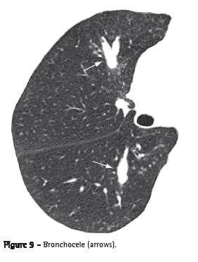 Traction bronchiectasis and traction bronchiolectasis refer, respectively, to bronchial and bronchiolar dilatation secondary to the retraction of the parenchyma resulting from fibrosis (Figure 13).(3) They manifest as bronchial and bronchiolar dilatations, often irregular, associated with the distortion of the parenchyma due to fibrosis and other lung alterations (principally reticular opacities, ground-glass opacities and consolidations). They have a tubular, cystic or microcystic aspect (peripheral bronchioles), depending on the relationship between the bronchial axis or the bronchiolar axis and the CT scan slice. This last aspect can be confused with honeycombing, another alteration frequently associated with pulmonary fibrosis.(28)
