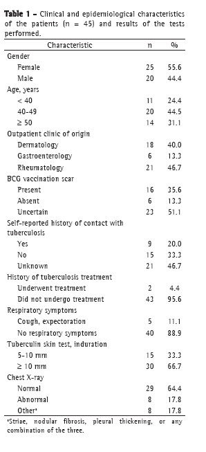 All patients who had chronic inflammatory diseases, were candidates for TNF- inhibitor use, and were referred for evaluation at the HUWC/UFC tuberculosis outpatient clinic during the study period were considered eligible for inclusion in the present study. A total of 68 patients were eligible. Of those, 45 were diagnosed with LTB. The diagnosis was based on anamnesis, clinical examination, chest X-ray, and TST using the Mantoux method. The TST was performed by a trained HUWC/UFC Clinical Analysis Laboratory technician and consisted of delivering PPD RT23 tuberculin intradermally in the middle third of the anterior face of the left forearm at a dose of 0.1 mL, which is equivalent to 2 tuberculin units. The TST was read 72-96 h after its application, and the result corresponded to the measurement (in mm) of the maximum transverse diameter of the area of palpable induration. Indurations > 5 mm were considered indicative of a positive response.(9,10)