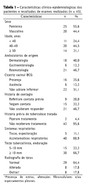 As características clínico-epidemiológicas dos pacientes estudados classificados como portadores de TBL estão descritas na Tabela 1. A avaliação diagnóstica consistiu de história clínica (contatos com bacilíferos e referência a diagnóstico de tuberculose ou a tratamentos anteriores para tuberculose), avaliação clínica de sintomas respiratórios, verificação da cicatriz vacinal com BCG, análise do resultado do TT e análise dos achados radiológicos de tórax em PA e perfil. O contato com pacientes bacilíferos foi relatado por 9 (20,0%) dos indivíduos estudados. Dois pacientes referiram tuberculose pulmonar tratada anteriormente. A maioria (88,9%) era de assintomáticos respiratórios. A vacinação com BCG, confirmada pela presença da cicatriz no braço direito, estava presente em somente 16 pacientes (35,6%), enquanto 6 (13,3%) não apresentavam cicatriz vacinal. Quando questionados, 23 pacientes (51,1%) relataram não saber se haviam sido vacinados com BCG.