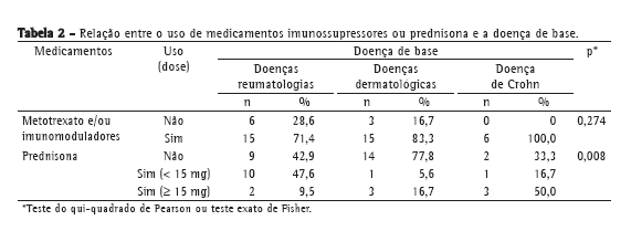 Na Tabela 2 podemos observar a correlação entre o uso de fármacos imunossupressores e o diagnóstico de base. A maioria dos pacientes encaminhados ao ambulatório de tisiologia para o rastreamento e tratamento da TBL foi tratada anteriormente ou ainda estava utilizando fármacos imunossupressores em regime isolado ou em combinação: 36 pacientes (80,0%) utilizavam metotrexato ou outros imunomoduladores, e 20 (44,4%) utilizavam prednisona.