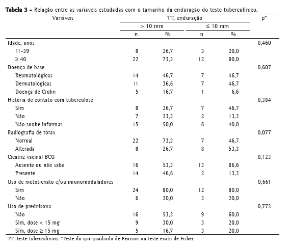 Na Tabela 3 podemos observar a influência de algumas variáveis que poderiam estar implicadas na alteração da resposta imunológica ao TT nos pacientes estudados. Entretanto, não foi encontrado nenhum fator estatisticamente significativo mostrando uma associação entre as variáveis estabelecidas e o resultado do TT. No entanto, 16 pacientes com cicatriz vacinal apresentaram uma média de enduração do TT igual a 15,7 mm, e 14 desses apresentavam enduração > 10 mm.