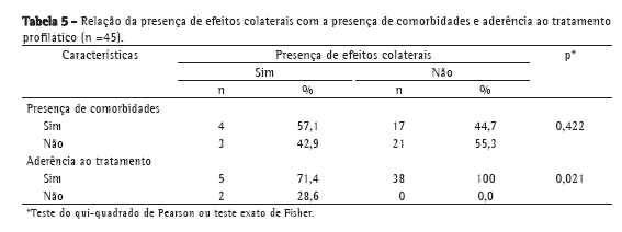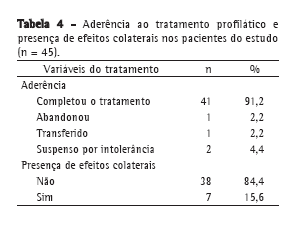 A Tabela 5 mostra que a maioria dos pacientes (38/43; 88,4%) encerrou o tratamento profilático sem apresentar qualquer efeito colateral, o que foi significativo (p = 0,021). O surgimento de efeitos colaterais considerados leves, tais como queixas gástricas, dor epigástrica, pirose, neuropatia periférica e urticária, ocorreu em apenas 5 (11,6%) dos 43 pacientes que enceraram o tratamento. A suspensão do tratamento por hepatite medicamentosa ocorreu em 2 dos 45 pacientes estudados (4,4% dos casos).