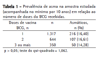 Dentre os 2.311 indivíduos do estudo, 373 (16,14%) desenvolveram asma. O número de asmáticos entre as 1.317 pessoas que receberam apenas uma dose da vacina BCG foi 216 (16,40%); entre os 644 que receberam duas doses de BCG, 107 (16,61%) desenvolveram asma; e entre os 350 que receberam três ou mais doses de BCG, 50 (14,28%) desenvolveram asma (Tabela 1).