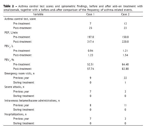 Expanding medical costs constitutes one of the most difficult public health problems in every country. Although omalizumab is an expensive drug, cost-effectiveness analysis has shown it to be cost-effective in patients with severe persistent asthma.(2) In both of our cases, the patients improved dramatically and good control of asthma was achieved. The number of asthma exacerbations and hospitalizations was significantly reduced in Case 1 and Case 2. After receiving treatment with omalizumab, both patients scored much higher on the ACT. In addition, neither patient has since required oral corticosteroids for reducing asthma exacerbations during evaluations. Maintenance oral corticosteroid therapy is frequently prescribed in order to achieve control in patients with severe persistent asthma. However, regular oral corticosteroid use is associated with significant systemic side effects, including cataracts, hyperglycemia among individuals without diabetes, osteoporosis, acne, weight gain, sleep disorders, and mood disturbances.(9) Omalizumab can also reduce the need for rescue and maintenance oral corticosteroids, as has previously been demonstrated.(10)