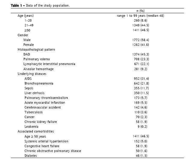This study was approved by the Ethics Committee of the University of São Paulo School of Medicine and was conducted according to the guidelines for research involving human beings established in Brazilian National Health Council Resolution no. 196/96. It was carried out in the University of São Paulo School of Medicine Department of Pathology, which operates out of the Hospital das Clínicas, a tertiary health care facility receiving a great number of patients presenting diseases of high complexity. From 1990 to 2000, 18,899 autopsies were performed, translating to an annual mean of 1889 autopsies; within the last five years, autopsies were performed in 60% of all cases of in-hospital death.(4,5) At our institution, all autopsies are performed by a resident pathologist, supervised by a senior pathologist who also checks the histological analysis to prepare the final reports. The final reports contain an abridged description of the principal clinical, laboratorial and radiological data of the patients. After reviewing the final reports, we selected all patients over 1 year of age who presented ARF and diffuse infiltrates on chest X-ray. We also obtained the following data for each patient: age, gender, major underlying disease, pulmonary cause of immediate death and associated comorbidities.