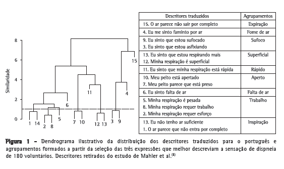 É importante traçar um paralelo entre os resultados evidenciados com o emprego de descritores de dispneia, traduzidos a partir da língua inglesa, com aqueles obtidos empregando-se descritores desenvolvidos a partir de nossa própria população, os quais foram relatados em um artigo relacionado.(16) Quatro das frases empregadas nos descritores nacionais foram praticamente as mesmas dos descritores traduzidos: "Eu tenho a sensação que estou sufocando" e "Eu sinto que estou sufocando"; "Eu sinto aperto no peito" e "Meu peito está apertado"; "Minha respiração fica rápida" e "Eu sinto que minha respiração está rápida"; e "Minha respiração fica pesada" e "Minha respiração é pesada". Uma das frases foi idêntica nos dois grupos de descritores ("Eu sinto falta de ar"). Dos sete agrupamentos formados com o emprego de descritores brasileiros, cinco ganharam denominações semelhantes àqueles obtidos com o uso dos descritores traduzidos. Isso aconteceu porque, ainda que as palavras e as frases utilizadas não tenham sido exatamente as mesmas, os agrupamentos formados tinham significados relacionados. Esse é o caso dos agrupamentos nacionais "sufoco", "aperto", "rápido", "trabalho/inspiração" e "falta de ar". Vale notar que o uso de descritores traduzidos levou à individualização dos agrupamentos "trabalho" e "inspiração". Mais uma vez, esse conjunto de dados indica que os modos como diferentes populações e culturas descrevem suas sensações de dispneia guardam relação estreita entre si.