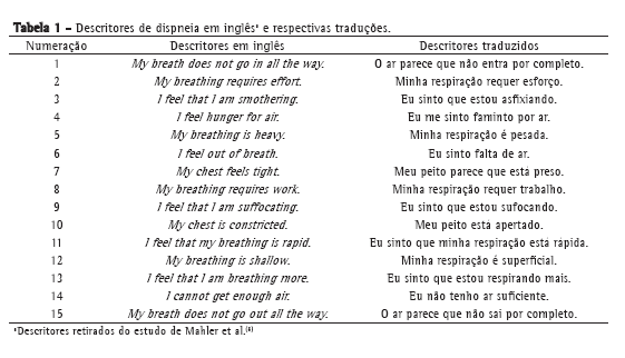 No presente estudo, relatamos os resultados da aplicação de outra lista de descritores de dispneia, traduzidos da língua inglesa e originalmente desenvolvidos nos EUA,(8) a esses mesmos grupos de pacientes. Ainda são tecidas considerações comparativas entre os resultados obtidos com o emprego dos descritores traduzidos em relação ao estudo americano original(8) e ao emprego de descritores desenvolvidos no Brasil.