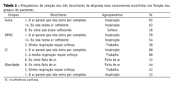 Características linguísticas e culturais próprias de cada idioma e país, e mesmo variações regionais, guardam o potencial de influenciar o modo como os indivíduos expressam sua sensação de falta de ar. Em um artigo relacionado a este estudo, relatamos o processo de desenvolvimento de descritores de dispneia específicos, a partir de expressões coletadas de alguns pacientes que referiam falta de ar, moradores de uma região do interior paulista.(16) A aplicação de uma lista final composta por 15 expressões nacionais descritoras de dispneia a 180 pacientes, portadores de quatro condições clínicas distintas, levou à formação de sete agrupamentos de descritores. Contudo, devido à superposição do uso de descritores semelhantes, não foi possível uma adequada distinção entre pacientes com asma, DPOC, insuficiência cardíaca (IC) e obesidade graus II ou III.