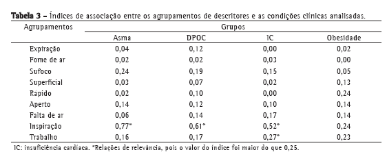 No tocante à análise das associações entre os agrupamentos e as condições clínicas, o agrupamento "inspiração" mostrou forte relação com asma, DPOC e IC. O agrupamento "trabalho" também se associou com IC. Por outro lado, não foram observadas associações relevantes entre nenhum agrupamento e obesidade (Tabela 3).