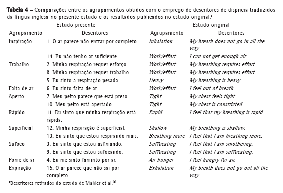 A Tabela 4 ilustra uma comparação entre os agrupamentos obtidos com a aplicação dos descritores traduzidos em nossa amostra de pacientes e os resultados originais do estudo em língua inglesa.(8) Observa-se um grau de semelhança muito grande na distribuição dos descritores em grupos. Sete agrupamentos que corresponderam exatamente a achados do estudo original americano (tight, rapid, suffocating, air hunger, exhalation) receberam denominações traduzidas semelhantes (aperto, rápido, sufoco, fome de ar e expiração). Das oito frases restantes, quatro acabaram em agrupamentos que exibiram algum grau de similaridade com a distribuição encontrada no manuscrito original (frases 1, 2, 8 e 12),(8) de tal modo que os seus agrupamentos obtidos em português acabaram recebendo denominações relacionadas com os nomes originais em inglês - inhalation (inspiração); work/effort (trabalho); e shallow (superficial). Apenas a frase 6 levou a um agrupamento completamente distinto do descrito anteriormente e que recebeu a denominação de "falta de ar".