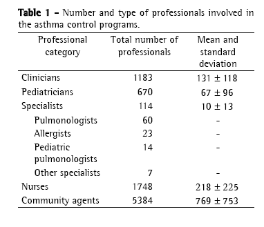 Table 1 shows that the absolute number of professionals involved in the asthma control programs was satisfactory: 1183 clinicians, 670 pediatricians and 114 specialist physicians. In total, there were 1967 physicians, who can be considered disseminators of acquired knowledge to all parts of the country. In addition, the environment is extremely favorable, since there is full public funding for the programs.