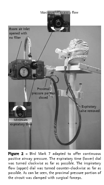 The Bird Mark 7 ventilator is cheaper than the conventional ventilators. It does not require electricity and is fairly common in the Brazilian hospitals. Many professionals have, empirically, adapted the Bird Mark 7 to offer NIV in CPAP mode.(7) However, the efficiency of this adaptation has never been studied. Knowledge of the proper way to make this adaptation and comparisons between its performance and that of specific NIV equipment might benefit patients in hospitals where equipment to deliver CPAP is not available.