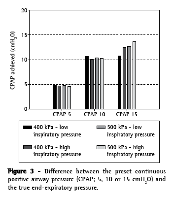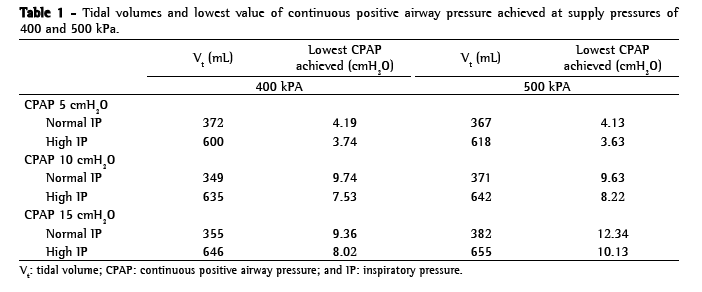 Regardless of the ventilator supply pressure (400 or 500 kPa), CPAP level and inspiratory pressure, the tidal volume generated by the Bird Mark 7 was quite comparable to that expected for the inspiratory pressure (360 mL in low inspiratory pressure and 650 mL in high inspiratory pressure - Table 1).