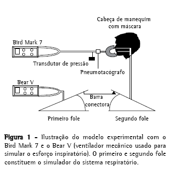 Às vias aéreas do manequim, foi conectado um transdutor de pressão (DP45-30; Validyne, Northridge, CA, EUA) que refletia a pressão da via aérea superior. Também à via aérea do manequim foi conectada um pneumotacógrafo (Flow Head 3700; Hans Rudolph, Kansas City, MO, EUA) para medida do fluxo inspiratório e obtenção do volume corrente (Figura 1).