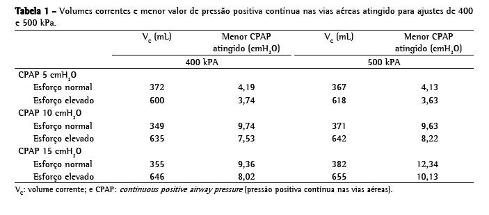 Independentemente da pressão de alimentação (400 ou 500 kPa), nível de CPAP e esforço inspiratório, o volume corrente gerado pelo Bird Mark 7 foi muito próximo do esperado para o esforço inspiratório (360 mL no esforço inspiratório baixo e 650 mL no esforço alto - Tabela 1).