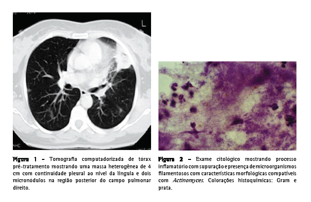 Uma paciente do sexo feminino, 55 anos de idade, caucasiana, não fumante, secretária, procurou atendimento no serviço de emergência. Tinha história de hepatite B crônica, hipertensão arterial, dislipidemia mista e múltiplas cáries dentárias não tratadas. Relatou que há três semanas havia iniciado quadro de dejeções diarréicas diárias, azia, desconforto retroesternal agravado pelo decúbito dorsal, astenia, anorexia e emagrecimento (5 kg). Uma semana depois haviam surgido toracalgia esquerda de características pleuríticas com agravamento progressivo, acessos freqüentes de tosse seca ao esforço e pico febril isolado. O eletrocardiograma foi normal, e a endoscopia digestiva alta revelou um cárdia complacente e gastrite antral. A telerradiografia de tórax mostrou hipotransparência heterogênea, esboçando perda de substância em seu seio, no terço médio do campo pulmonar esquerdo. A tomografia computadorizada de tórax evidenciou a presença de uma massa de 4 cm com conteúdo heterogêneo e continuidade pleural ao nível da língula e a presença de dois micronódulos subpleurais na região posterior do campo pulmonar direito (Figura 1). Procedeu-se ao estudo etiológico considerando-se a hipótese diagnóstica de neoplasia pulmonar como a mais provável. Do estudo analítico, salientam-se os seguintes resultados: velocidade de hemossedimentação = 98 mm/1a h; antígeno do câncer 125 = 63,3 U.mL-1 (<35,0); antígeno carcinoembriogênico = 3,55 ng.mL-1 (<2,5) e discreta elevação da proteína C reativa. O estudo imunológico sérico, os marcadores virais e o estudo analítico final não revelaram outras alterações relevantes. Os resultados da colonoscopia, da ultrassonografia abdominopélvica, da mamografia e da citologia cérvico-vaginal foram normais. A primeira fibrobroncoscopia realizada mostrou sinais inflamatórios difusos ao nível da língula. Os resultados do exame citológico de aspirado, lavado brônquico e lavado broncoalveolar foram negativos para células neoplásicas. O exame microbiológico em aerobiose foi também negativo, assim como a pesquisa de bacilos álcool-ácido resistentes. A paciente foi então submetida à biópsia aspirativa transtorácica (BAT), que, ao exame citológico extemporâneo, mostrou um processo inflamatório com supuração. Face a este resultado provisório, iniciou-se a antibioticoterapia com levofloxacina 500 mg via oral ao dia, e decidiu-se realizar uma segunda fibrobroncoscopia. Entretanto, o exame citológico da BAT revelou aspectos morfológicos compatíveis com a presença de Actinomyces, confirmada pelo exame microbiológico cultural do lavado brônquico e broncoalveolar da segunda fibrobroncoscopia, no qual se identificou A. naeslundii (Figura 2). A pesquisa de bacilos álcool-ácido resistentes foi negativa. Dada a melhoria clínica e radiológica após um mês de tratamento (Figura 3), optou-se por manter a antibioticoterapia já iniciada, cuja posologia foi alterada: levofloxacina 500 mg endovenoso ao dia por quatro semanas e, depois, 500 mg po qd. Não se verificou iatrogenia à terapêutica, a qual foi mantida por 16 semanas, até a completa normalização radiológica. Analiticamente constatou-se uma redução da velocidade de hemossedimentação e uma redução de ambos os marcadores tumorais inicialmente alterados, assim como a normalização da proteína C reativa. A paciente foi também submetida a tratamento dentário.