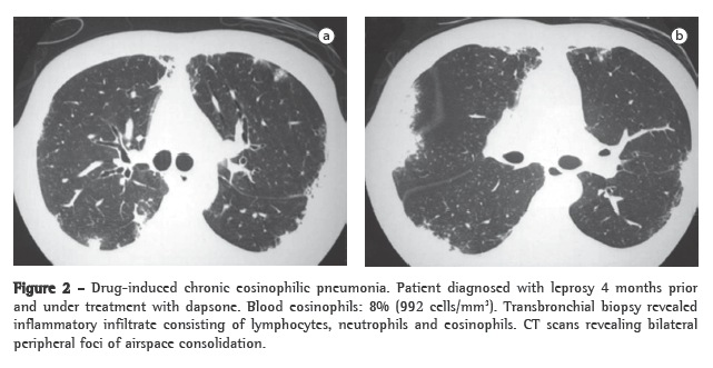 In 63% of cases, the radiological profile is highly suggestive of the diagnosis and reveals peripheral pulmonary infiltrate, primarily in the pleural space. The typical profile of diffuse bilateral peripheral infiltration is found in 25% of cases (Figure 1). The main differential diagnosis should be cryptogenic organizing pneumonia or drug-induced pneumonia.(23)