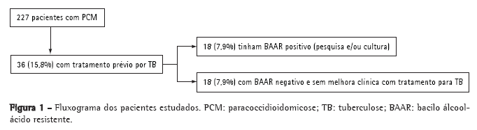Apesar destas diferenças, não é incomum o diagnóstico diferencial entre as duas doenças ser difícil. Vários trabalhos relatam casos de associação entre PCM e TB. Em um trabalho que analisou 338 casos de PCM,(12) foram encontrados 46 pacientes (13,65%) que também haviam recebido o diagnóstico de TB. Os pacientes foram divididos em 3 grupos: