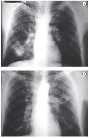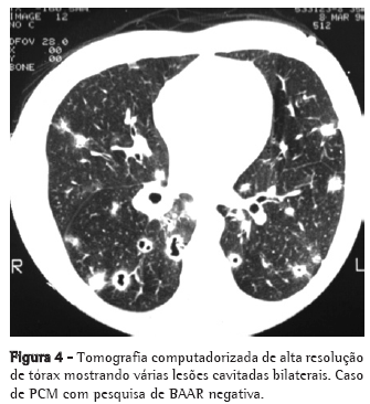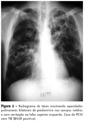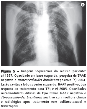 Um caso em particular nos parece ilustrativo da associação real entre PCM e TB. Há 4 anos, o paciente teve diagnóstico confirmado de PCM por meio de exame positivo para pesquisa de P. brasiliensis, foi tratado com sulfametoxazol-trimetoprim por 2 anos e o tratamento foi suspenso por melhora clínica e negativação da sorologia. Este paciente voltou a apresentar queixas respiratórias 6 meses após o término do tratamento para PCM, quando foi diagnosticado como portador de TB (por meio de baciloscopia positiva para bacilos álcool-ácido resistentes) e recebeu tratamento com esquema I (rifampicina, isoniazida e pirazinamida), com boa resposta clínica e cura. O paciente queixou-se novamente de febre, perda de peso, tosse pouco produtiva e dispnéia 4 meses após o término do tratamento para TB, quando recidiva da PCM foi confirmada (Figura 5) e o tratamento com sulfametoxazol-trimetoprim foi novamente instituído.