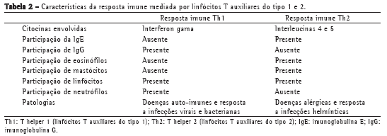 Apesar da controvérsia existente sobre este tema, algumas hipóteses foram elaboradas para explicar o mecanismo da possível inibição da reatividade ao teste alérgico cutâneo e dos sintomas de asma nos indivíduos infectados por helmintos. Inicialmente, acreditava- se que a resposta imune Th1 tivesse ação antagônica à resposta imune Th2, uma inibindo a outra.(34) Desta forma, seria esperado que as infecções virais e bacterianas, que desencadeiam uma resposta imune Th1, inibissem a inflamação alérgica (Th2), e que as infecções helmínticas (Th2) estimulassem o surgimento da inflamação alérgica. Entretanto, esta forma polarizada de classificação da resposta imune é muito simplista para os seres humanos, nos quais as citocinas Th1 participam do processo inflamatório das doenças alérgicas (Th2)(35,36) e do processo inflamatório das doenças auto-imunes (Th1).(37,38) Além disto, como descrito anteriormente, alguns estudos sugerem que as infecções helmínticas (Th2) inibem o surgimento das alergias (Th2), o que é incompatível com o modelo de polarização da resposta imune. (Tabela 2)