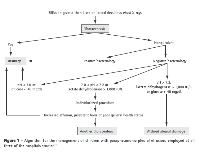 For children with complicated parapneumonic pleural effusion in whom the radiological findings include loculated or septated fluid collection (fibrinopurulent stage), thoracoscopy is recommended.(4) For children without radiological evidence of septated or blocked parapneumonic pleural fluid collection, thoracentesis is indicated in order to determine whether the parapneumonic pleural effusion is complicated; when there is turbid/purulent fluid, bacteria or biochemical alterations (pH < 7 or glucose < 40 mg/dL), surgical drainage of the effusion is indicated.(2) For such children (those without evidence of septated fluid collection), thoracentesis is essential and should be preferably performed before the initiation of antibiotic treatment, especially if there is a lateral decubitus chest X-ray finding of parapneumonic pleural effusion > 1 cm between the lung and the chest wall.(4,13)