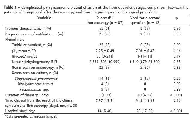DiscussionThe effectiveness of thoracoscopy in our patients (88%) is within the range reported in the literature, according to which complicated parapneumonic pleural effusion improves in 71-100% of children undergoing surgery.(5,17-27) In children for whom thoracoscopy was insufficient to produce clinical improvement, and in whom a second surgical procedure was required, another thoracoscopy was always the first choice. This was not possible in some children, since complicated parapneumonic pleural effusion had evolved to the organized stage, with lung entrapment, and thoracotomy or thoracostomy was therefore required. Although both procedures can be performed at this stage of complicated parapneumonic pleural effusion, we chose to perform thoracostomy in children who had poor general health status or who were debilitated, in whom thoracotomy would significantly increase surgical risk.(4)