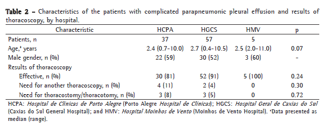 to complicated parapneumonic pleural effusion at the fibrinopurulent stage, thoracoscopy was successful in 87 (88%) and a second surgical procedure was required in 12 (12%). The procedure was performed at the HCPA in 37 cases, at the HGCS in 57 and at the HMV in 5 (Table 2). There were no differences among the various hospitals in terms of age or gender of the children undergoing the procedure; nor were there any such differences in terms of the efficacy of thoracoscopy or the need to repeat the procedure (Table 2). Although each of the three hospitals had its own surgical team, the same treatment algorithm was used in all cases, and no differences were found among the hospitals in terms of the treatment results obtained for the children with complicated parapneumonic pleural effusion at the fibrinopurulent stage (Table 2).