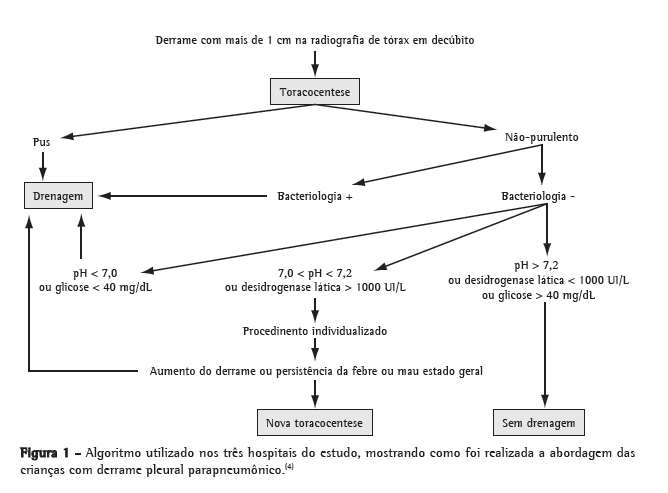 Naquelas crianças com achados radiológicos de DPPC com líquido loculado ou septado (fase fibrinopurulenta), preconiza-se a realização de toracoscopia.(4) Nas crianças sem evidência radiológica de líquido pleural parapneumônico septado ou bloqueado, indica-se a realização de toracocentese para que se determine se o DPP é complicado: a presença de líquido turvo ou purulento, bactérias ou alterações bioquímicas (pH < 7 e glicose < 40 mg/dL) indicam a drenagem cirúrgica do derrame.(2) Para essas crianças sem evidência de líquido septado, a toracocentese é fundamental e deve ser ­realizada, de preferência, antes do início do uso de antibióticos, especialmente se houver o achado, em radiografia torácica em decúbito lateral, de DPP > 1 cm entre o pulmão e a parede torácica.(4,13)