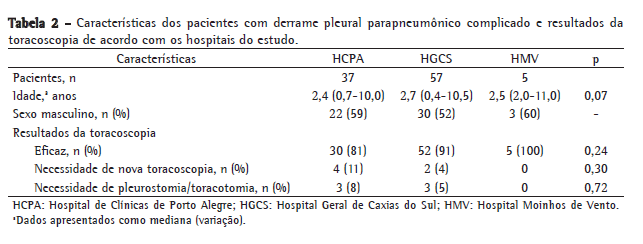 A avaliação de 99 crianças submetidas à toracoscopia devido ao DPPC na fase fibrinopurulenta mostrou que ela foi efetiva em 87 pacientes (88%); em 12 (12%) houve a necessidade de outro procedimento cirúrgico (Tabela 1). Do total da amostra, 37 pacientes foram operados no HCPA, 57 no HGCS e 5 no HMV (Tabela 2). Não houve diferenças na idade, sexo, eficácia e necessidade de outros procedimentos entre as crianças operadas nos diferentes hospitais (Tabela 2). Usando o mesmo algoritmo de tratamento nos três hospitais, por equipes de cirurgiões distintas, não se observou diferença quanto ao resultado no tratamento de crianças com DPPC na fase fibrinopurulenta (Tabela 2).
