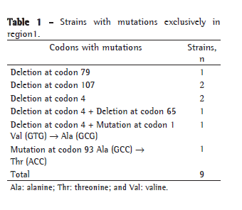 As can be seen in Table 1, 9 strains presented mutations exclusively in region 1. Table 2 shows that 60 strains presented mutations exclusively in region 2. Table 3 describes the mutations that occurred in 21 strains, both in region 1 and in region 2.