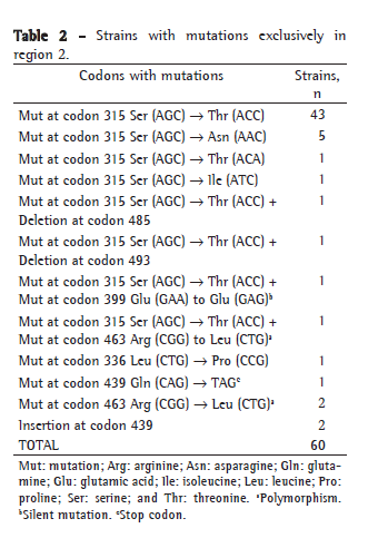 The objective of the present study was to analyze the mutations in two different regions of the katG gene-the initial region and the region containing codon 315-as well as to compare these regions in terms of type and number of mutations.