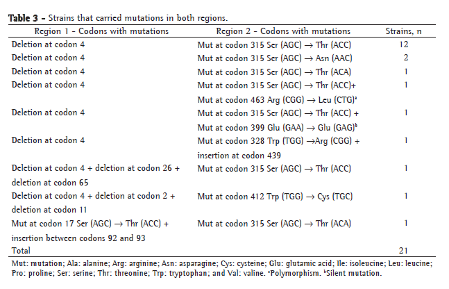 In region 1, there were a large number of insertions and deletions, resulting in an amino acid change in the protein, reduced catalase levels and INH resistance. In 24 strains, we found a new allele, which has not been previously described, generated by the deletion of the last adenine nucleotide at codon 4, region 1. Region 2 was essentially characterized by mutations, most of which were at codon 315. This mutated codon is an important marker of INH resistance, and its frequency suffers marked regional variations. A study conducted in Brazil analyzed 97 INH-resistant strains from two states (São Paulo and Paraná).(23) The authors observed 83 mutations in the katG gene (85.6%), 60 (61.9%) of which were at codon 315 and 23 (23.7%) of which were at other codons. Of the 97 strains studied, 14 (14.4%) did not have mutations in the katG gene. Of those, 12 (12.4%) presented mutations in other genes. An arginine-to-leucine substitution at position 463 (polymorphism) occurred in 2 cases (2.1%). In the space corresponding to region 1 in our study, there was 1 insertion at nucleotide 17 and 4 mutations. In the area corresponding to region 2 in our study, there were 2 insertions, 1 deletion and 74 mutations, principally serine-to-threonine mutations, 58 of which were at codon 315.
