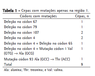 Conforme a Tabela 1, 9 cepas apresentaram mutações somente na região 1. A Tabela 2 mostra que 60 cepas apresentaram mutações apenas na região 2. A Tabela 3 descreve as mutações que ocorreram em 21 cepas, tanto na região 1, quanto na região 2.