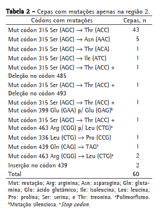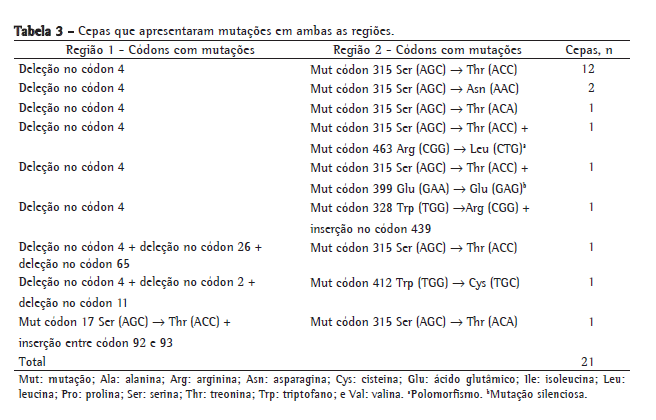 Em outras 44 cepas, houve mutações de serina (AGC) para treonina (ACC) associadas a mutações na região intergênica mabA-inhA e apenas 3 mutações no gene inhA. Portanto, ocorreram 288 mutações no códon 315 (90,8%), e 26 cepas resistentes à INH (8,2%) não mostraram mutações nos dois genes.(29)