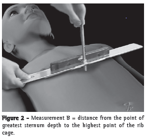 With the aim of creating a simple and objective method of assessing the deformity, the Thoracic Surgery Department of the Heart Institute (a branch of the University of São Paulo School of Medicine Hospital das Clínicas) developed the PEX anthropometric index (PEX-AI).(4) To calculate the PEX-AI, two measurements suffice: measurement A, defined as the greatest anteroposterior distance (Figure 1); and measurement B, which is the greatest depth of the deformity (Figure 2). Patients with an PEX-AI under 0.12 are considered normal, whereas those who present PEX-AI values equal to or greater than 0.12 are considered to have PEX. This index is easily obtained through physical examination of a patient in a medical office, i.e. the PEX-AI does not depend on radiologic or imaging exams, which implies a reduction in costs and morbidity. In addition to evaluating the deformity, the PEX-AI can assess the surgical results irrespective of the operatory technique used.