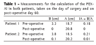 In both cases, the deformity was the most pronounced in the caudal portion of the sternum. There were no evident alterations of the pectoral musculature or sternal notch. The deformed position of the costal arches was considered compensatory and was responsible for the smaller anteroposterior diameter of the chest cavity. The patients were examined on two occasions: on the day of the operation; and on post-operative day 60. The clinical measurements for obtaining the PEX-AI were taken with the patient in the horizontal dorsal decubitus position on a flat table that was parallel to the floor. Each measurement was taken during a deep inspiration. The numeric value of the ratio of the second measurement to the first provides the index: PEX-AI = B/A. Therefore, the index varies between 0 and 1. The lower the value, the lower the degree of deformity.