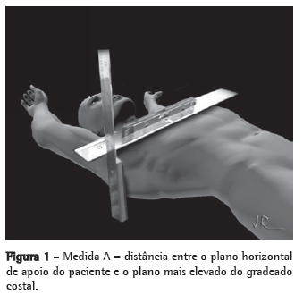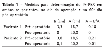 Também ambos apresentavam deformidade mais acentuada na porção caudal do esterno. Não havia alterações evidentes em musculatura peitoral ou no manúbrio; a posição deformada dos arcos costais foi considerada compensatória e como a responsável pela redução do diâmetro antero-posterior da caixa torácica. Os pacientes foram examinados em duas oportunidades: no dia da operação e novamente medidos no 60º dia de pós-operatório. As medidas clínicas para obtenção do IA-PEX foram realizadas com paciente em decúbito dorsal horizontal, em mesa plana paralela ao piso e durante inspiração profunda. O valor numérico da relação da segunda medida pela primeira fornece o índice: IA-PEX = B/A. Portanto, o índice varia entre 0 e 1, sendo que, quanto menor, também menor a deformidade.