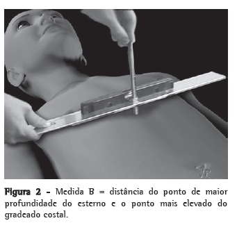 Com a finalidade de criar um método simples e objetivo para avaliar a deformidade, a Disciplina de Cirurgia Torácica do Instituto do Coração (Hospital das Clínicas da Faculdade de Medicina da Universidade de São Paulo) desenvolveu o índice antropométrico para PEX (IA-PEX).(4) Para cálculo do IA-PEX bastam duas medidas: medida A, definida pela maior distância antero-posterior (Figura 1), e medida B, maior profundidade do defeito (Figura 2). São considerados normais os pacientes com IA-PEX menor que 0,12; os que apresentam valores do IA-PEX maiores ou iguais a 0,12 são portadores de PEX. Este índice é obtido simplesmente pelo exame físico do paciente portador de PEX em consultório; ou seja, o IA-PEX não depende de exames de radiológicos ou de imagem, o que implica em redução de custos e morbidade. Pode avaliar, além da deformidade, o resultado cirúrgico, independentemente da técnica operatória empregada.