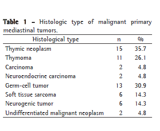 The present study evaluated a group of patients with primary malignant mediastinal neoplasms of various histologic types. However, all of the patients were submitted to surgical procedures with curative intent. We selected this specific group of patients in order to identify preoperative factors associated with the ability to achieve complete surgical resection.