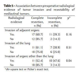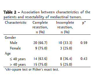 Complete resection has been shown to be a significant determinant of prognosis among patients submitted to surgery for the treatment of invasive primary mediastinal tumors.(9) Age, together with the characteristics of preoperative imaging studies determining the location and consistency of mediastinal tumors, can suggest the diagnosis and the likelihood of malignancy.(1,10-12) However, the factors predicting the resectability of such tumors have not been reported. The aim of the present study was to identify preoperative characteristics associated with the ability to achieve complete surgical resection in a group of patients with primary malignant mediastinal tumors.