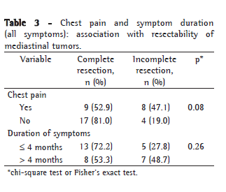 One of the most common clinical manifestations, chest pain, was observed in 66.7% of the patients submitted to incomplete resection, compared with only 34.6% of those submitted to complete resection, although this difference did not reach statistical significance (p = 0.08). This finding suggests that chest pain is associated with locally advanced tumors and with lower probability of complete surgical resection. Some authors have described chest pain as a predictor of survival among patients with chest wall tumors.(22) However, there is no data regarding this characteristic in patients with primary malignant mediastinal neoplasms. Chest pain might be related to chest wall invasion by mediastinal tumors or even to invasion of other adjacent anatomical structures. Invasion of the chest wall (sternum or ribs) should not present technical obstacles to complete surgical resection, since sternum and ribs can be resected with adequate margins. Therefore, we believe that any association between chest pain and resectability is not related to the extent of local invasion, although no definitive conclusion can be made based on the data currently available.